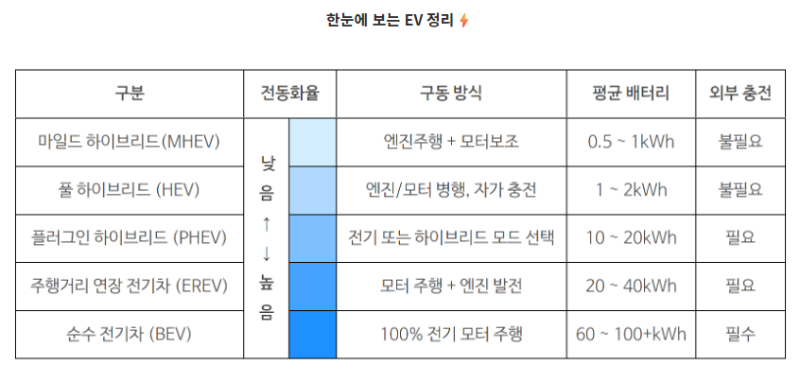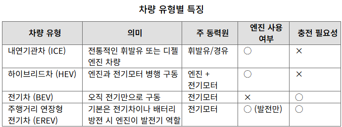 | 특징 | 순수전기차 (BEV) | 주행거리연장형 (EREV) | 플러그인하이브리드 (PHEV) |