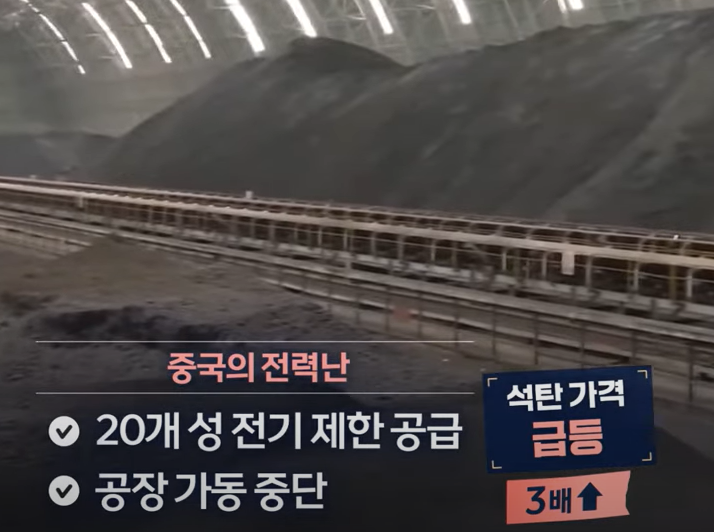 공장들은 가동을 중단하거나 조업시간을 크게 줄였습니다. 석탄 가격 급등이 원인입니다. 중국은 전력의 생산 60%를 석탄에 의존하고 있는데 경기회복으로 수요가 늘면서 화력발전용 석탄 가격이 1년 만에 3배 넘게 뛰었습니다.