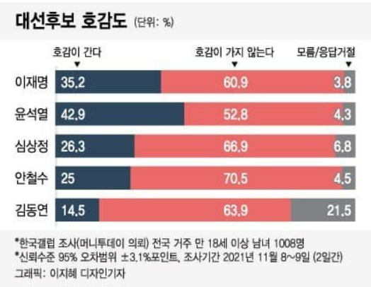 대선후보 5명의 호감도와 비호감도를 조사한 결과가 발표되었습니다.