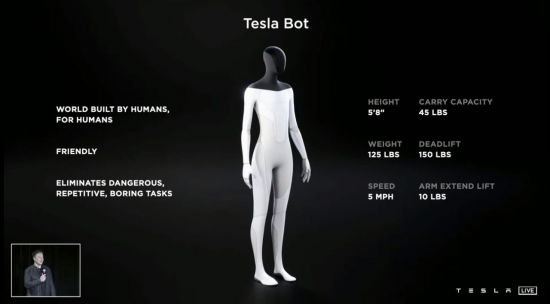 2021년 8월 인공지능 휴머노이드 '테슬라 봇' 공개한 바 있고 수년 내에 선보이겠다고 발표했습니다.