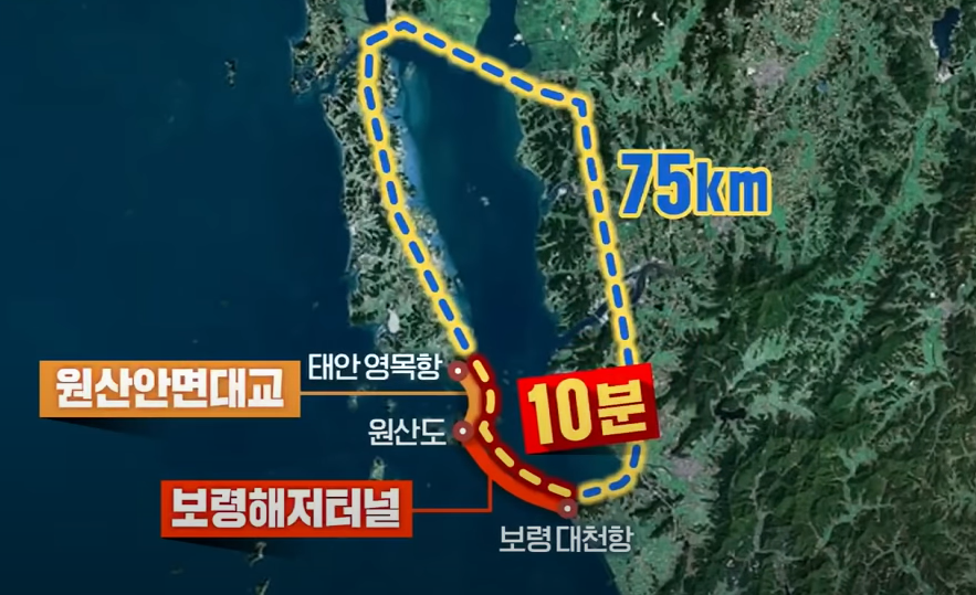 또 바다를 사이에 두고 서로 마주 보는 보령과 태안은 육지로는 75 km나 우해하며 1시간 반이나 걸렸지만 이젠 해저터널로 10분이면 서로 오 갈 수 있습니다.