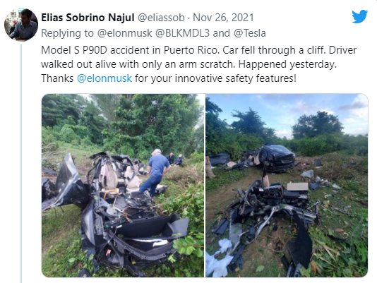이 사건의 소식은 한 트윗을 통해서 알려졌는데요. 푸에르토리코에서 발생한 테슬라 S P90D의 사고는 사진에서 느껴지듯이 엄청난 충격으로 걸레와 같이 구겨지고 찢겼지만 믿을 수 없는 일이 발생했습니다. 바로 운전자는 팔에 약간의 긁힘과 타박상을 입은 게 전부 인 채로 걸어서 차에서 나왔다고 합니다.