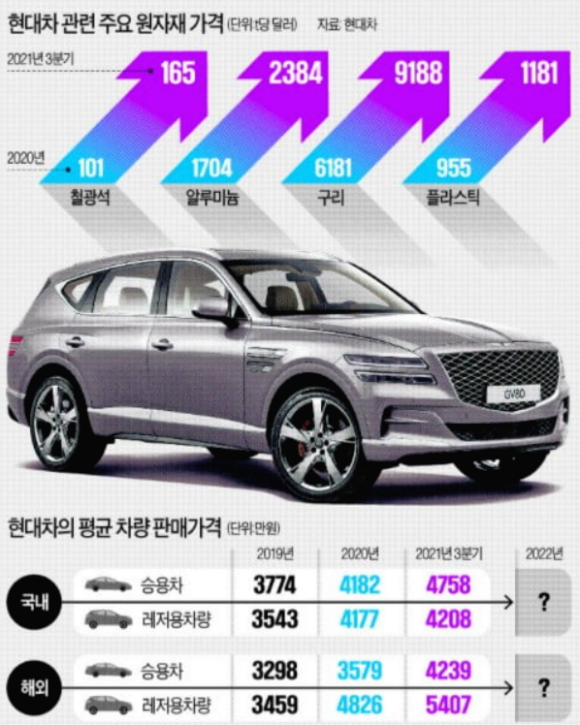 차량 인상의 가장 큰 이유는 차체의 기본이 되는 철강재의 가격인상 때문입니다. 포스코와 현대제철은 현대차에 공급하는 자동차 강판 가격을 톤당 12만 원 인상한 것으로 알려져 있습니다.