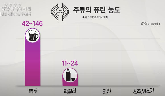주류별 퓨린의 농도비교 그래프를 보더라도 막걸리나 와인, 소주에 비해 맥주에 퓨린 함유량이 월등히 높은 것을 알 수 있습니다.
