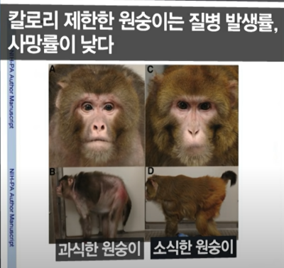 정제된 사료를 먹여서 칼로리를 제한했던 테스트와는 달리 완전식품으로 식사에 메뉴 부분을 고려한 테스트 결과에서는 오히려 소식한 원숭이와 삼시 세끼를 먹은 원숭이와 차이가 없었던 것이죠.