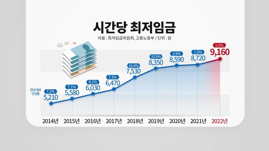 내년 최저시급이 9,160원으로 21년 대비 5% 인상되는 것으로 결정되었습니다. 소상공인 연합회가 발표한 실태조사에 따르면 사업장 1,204곳 중 17%가 최저임금 인상 정책 발표 이후 매장 직원을 감축했다고 합니다. 노동자의 생존권을 위해 올린 임금이 다시 노동자에게 부메랑이 되어 돌아오는 모순적인 상황이 벌어지고 있습니다.