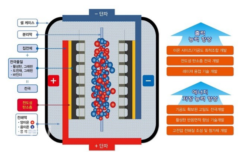 슈퍼 캐패시터는 이온들을 탄소 나노튜브 표면에 잘 달라붙게 만들어서 리튬이온 전지에 버금가는 에너지 저장성능을 발휘할 수 있습니다. 게다가 양극과 음극으로 이온의 이동도 역시 훌륭하여 리튬이온 전지보다 높은 출력의 저장장치로 평가받고 있습니다.