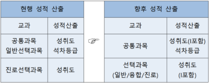 고교학점제 시행 이후 가장 궁금해하는 부분 중 하나는 평가방법과 내신성적의 대학 입시 적용 기준일 텐데요. 지금까지 발표한 바에 따르면 공통 과목은 9등급 상대평가로 성취도와 석차등급이 표시되고 선택과목(일반/융합/진로)는 A,B,C,D,E와 40% 미만 미이수(I) 5단계 성취도 평가가 적용됩니다.