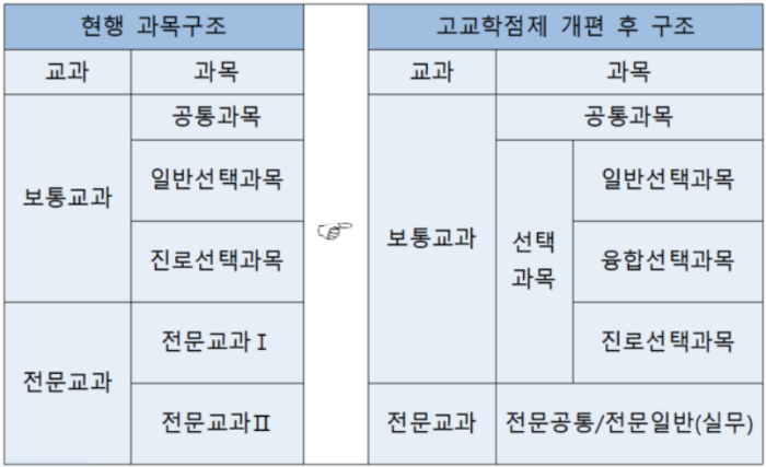 고교학점제가 시행되면 교과에 과목 구조가 바뀌게 되는데요. 현행 교육 과정은 보통교과, 전문교과로 나누고 보통교과는 공통과목, 일반선택과목, 진로선택과목으로 나뉘게 됩니다. 주로 특목고와 특성화고에서 배우는 전문 교과는 전문교과 1과 2가 있고, 고교학점제가 시행되면 보통 교과가 공통과목이나 선택과목으로 이루어지고 선택과목은 일반선택과목, 융합선택과목, 진로선택과목으로 나뉘게 됩니다.