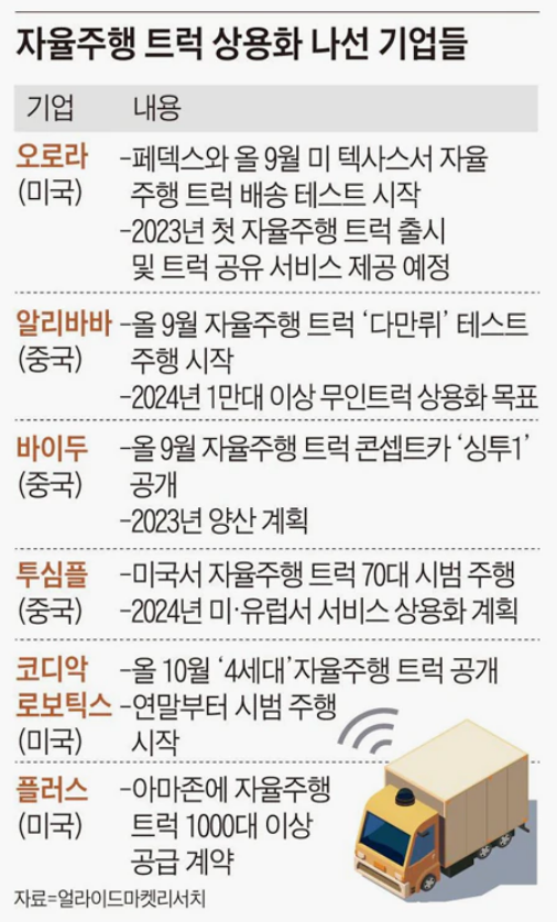이미 미국의 스타트업 '오로라' 나 중국의 '투심플'등의 현실적인 자율주행 트럭 '로보 트럭'의 네트워크를 구성하고 운행을 위한 준비를 마치고 있습니다.