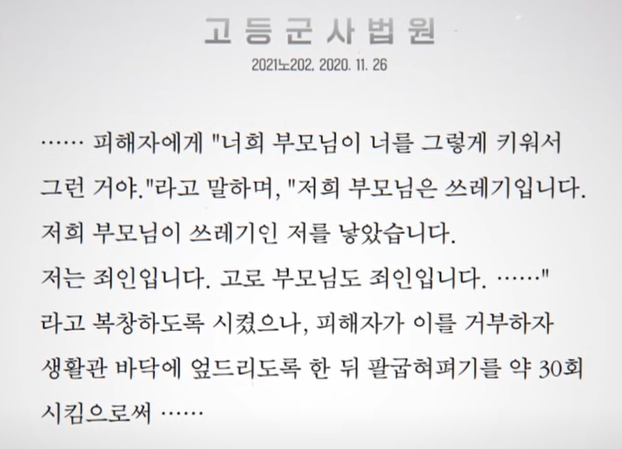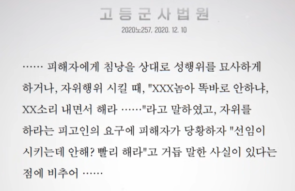 가혹행위와 관련된 최근 2년 내의 판결문에 따르면 2020년대에 디피 내에서 묘사된 가혹행위가 그대로 녹아들어 가 있었습니다. 일반적인 추세도 지난 5년간 군 폭행과 군 가혹행위의 발생건수가 증가하고 있는 것으로 나타났습니다.