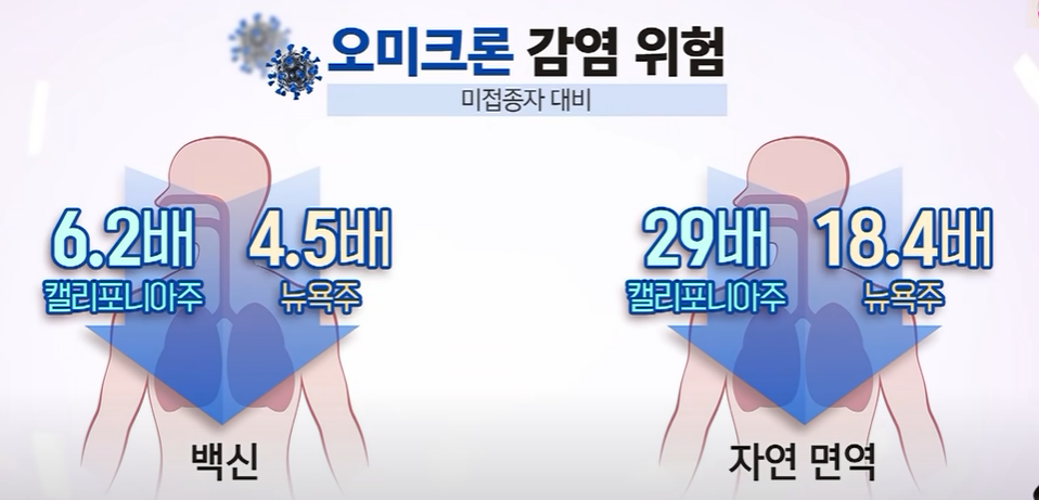 그런데 오미크론이 생긴 이후 상황은 역전되었습니다. 백신 면역은 감염 위험도를 6.2배 4.5 배 낮추는데 그쳤지만, 자연 면역은 29 배 18.4 배나 낮추는 것으로 나타났습니다.