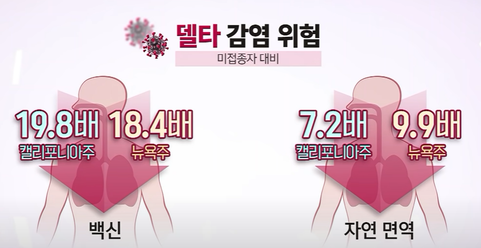 미국 질병예방통제센터의 보고서에 따르면 지난해 5월부터 11월 델타가 유명 유행하던 때를 기준으로 백신 접종자는 미접종자들에 비해 19.8 배 18.4 배 가량 감염위험이 낮았습니다. 그러나 자연 면역자는 감염위험이 각각 7.2배 9.9배 낮아지는데 그쳤다고 합니다.