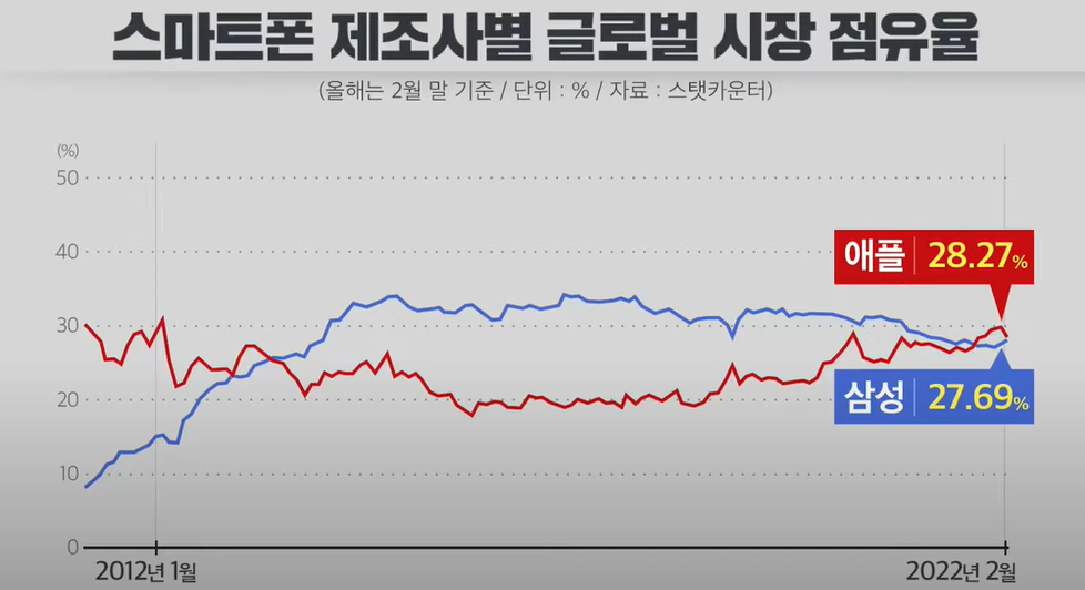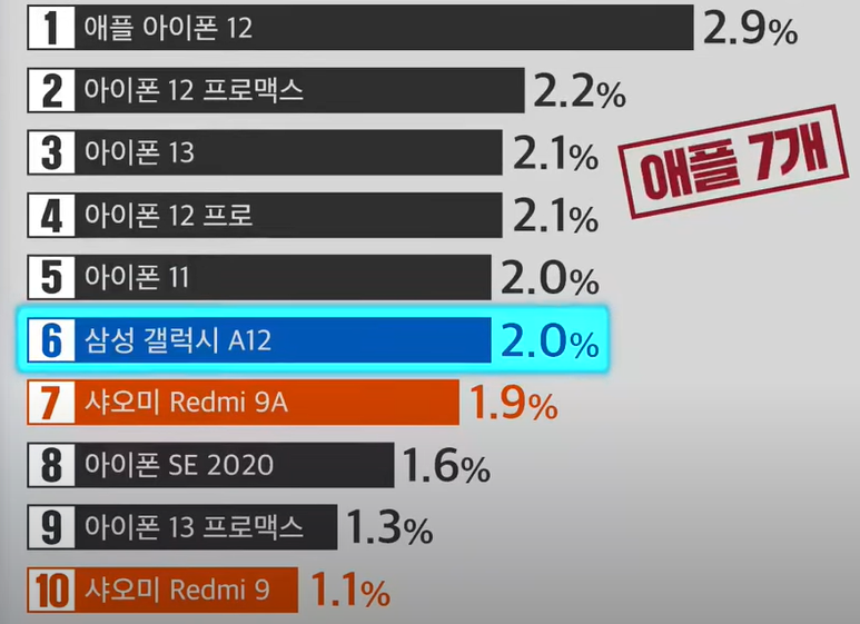 아직까지 삼성의 스마트폰 시장 점유율은 Top 위치에 있지만 겨우겨우 그 명맥을 이어가고 있다라는데 문제가 있습니다. 지난해 가장 많이 팔린 스마트폰 상위 10개 모델을 보게 되면 애플은 7개 모델인 반면 삼성은 한 개 모델만이 랭크되어 있습니다. 그것도 중저가 모델입니다. 그러다 보니 제품 판매에 따른 이익 수준도 압도적으로 애플에 밀리는 상황입니다. 지난해 세계 스마트폰 시장에서 나오는 이익의 80% 가까이를 애플이 가져가 버린 것입니다. 이러한 통계들이 의미하는 것은 삼성은 더 이상 하이엔드 제품을 판매해서 수익을 올리는 것이 아니라 중저가 제품을 많이 팔아 수익을 유지하고 있다는 점입니다. 즉 프리미엄 시장에서의 삼성 입지가 점점 줄어들고 있다는 얘기입니다.