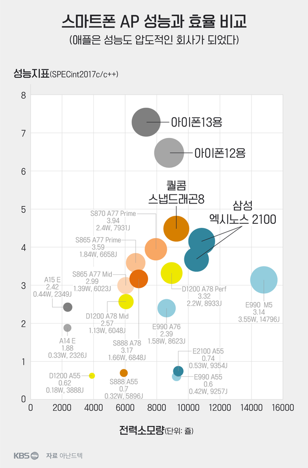 그래프를 보면 알 수 있듯이 발열이 적으면서도 성능이 우수한 칩은 아이폰 그리고 퀄컴 스냅드래곤 삼성 엑시노스 순입니다. 쉽게 말해서 성능과 효율 모든 면에서 삼성전자는 애플에 뒤지고 있다는 뜻입니다. 과거 '앱등이'라 비하하면서 애플 스마트폰 사용자들을 무시했던 이면에는 애플이 디자인과 고객 충성도 면에서 삼성을 능가한 것뿐이지 실제 제품 성능에서는 한참 못 미친다는 의견이 있었기 때문입니다. 그런데 현시점에서 AP 성능을 비교해보면 이제는 물리적인 성능면에서도 애플에 뒤지고 있다고 볼 수 있습니다. 기술적으로도 애플에 뒤지고 있기 때문에 발열에 대한 개선방안 역시 마땅한 대안이 없다는 것입니다. 만일 삼성이 애플에 A15 칩을 사용했더라면 GOS와 같은 제어 시스템이 필요 없었을 것입니다. 따라서 이번 문제는 스마트폰에 국한할 것이 아니라 바로 AP를 만드는 칩 기술의 차이에서 그 해답을 찾아야 한다는 것입니다.