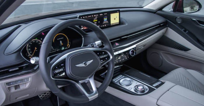 22년형 제네시스 G80 인테리어에는 12 방향으로 조절이 가능한 프런트 시트와 듀얼존 자동 실내 온도 조절장치, 14.5 인치 HD 내비게이션 화면을 갖추고 있습니다. 하이엔드 모델에는 무선 디바이스 충전기와 서라운드 뷰 모니터, 원격 주차 기능이 추가되어 있습니다. 전체적인 마감은 매우 훌륭하며 미니멀리즘이 적용된 레이아웃에 고급스러운 내장재로 제네시스의 매력적인 분위기를 한층 더 업그레이드시켰습니다.