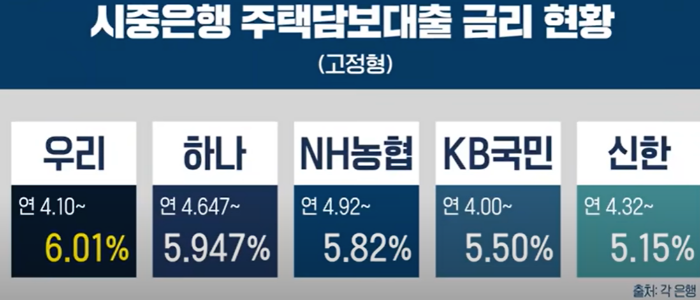 은행에서 고정형이라고 말하는 금리는 첫 5년간만 고정금리를 적용하고 이후 변동금리로 변경되는 혼합형 금리입니다. 시중은행에 주택 담보 대출 금리 현황을 살펴보면 최저가 4.1%에서 최고 6.01%까지입니다. 한국은행의 추가 기준 금리 인상 예정되어 있는 만큼 시중은행 주담대 금리 현황은 6%를 훌쩍 넘을 것으로 보입니다.