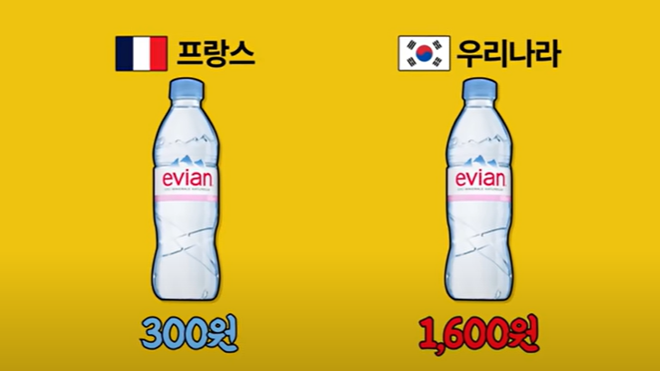 에비앙은 500ml 기준 프랑스 판매 가격은 0.22 유로 판매되고 있는데 우리나라 환율로 300원 정도입니다. 그리고 그게 우리나라로 넘어오면서 1,600원에 판매되고 있습니다. 이건 프랑스에서 국내로 들어오면서 물류비와 관세비용이 추가되기 때문에 비싸지는 건 어쩜 당연합니다. 하지만 캐나다에서 수입하는 생수 '아이스필드'가 캐나다 기준 400원보다 200원 더 비싼 600원에 판매되는 것에 비하면 일반적인 물류비와 관세에 따라 이렇게나 비싸지지는 않는 것으로 보입니다.