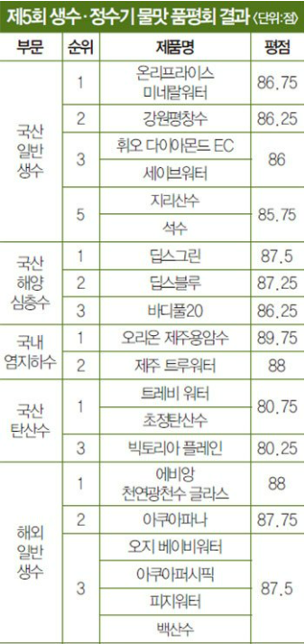 국내 '생수와 정수기 물맛 품평회'를 진행한 결과 미네랄 함량이 더 적은 '오리온 제주 용암수'가 '에비앙' 보다 더 높은 점수를 받았습니다. 이런 점을 볼 때 미네랄 함량이 많다고 해서 꼭 물 맛이 좋다고 볼 수는 없을 것 같습니다.