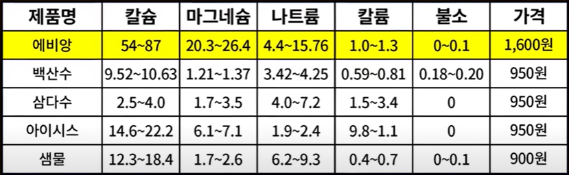 에비앙이 국내 생수에 비해 미네랄 함량이 많은 것은 사실입니다. 하지만 미네랄 함량이 가장 낮은 삼다수가 상대적으로 미네랄 함량이 많은 물보다 더 비싸거나 동등 수준에 있는 것을 보면 미네랄 함량이 풍부하다고 하여 더 비싼 것은 아닌 것으로 보입니다. 다른 생수들과 비교해도 가격차이가 크지 않은걸 보면 미네랄의 함량이 가격에 큰 역할을 끼친다고 보기 힘듭니다.