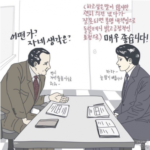 저 역시 15년 이상 회사생활을 하다 보니 위에 계신 선배들보다 후배들이 더 많은 위치가 되었습니다. 하지만 업무를 위해서 항상 부딪히게 되는 젊은 친구들에게 혹시 나도 꼰대로 비치지 않을까 조심스러워지곤 합니다. 하지만 정작 꼰대 같은 동료들은 그런 걱정은 하지 않는 것 같습니다. 만일 그런 생각을 가지고 있다면 꼰대 같은 말과 행동은 피할 테니 말입니다.