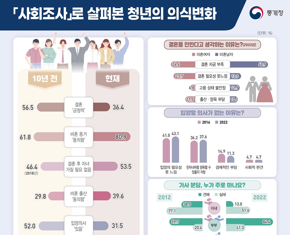 결혼 적령기에 있는 남녀들에게 조사한 결과가 흥미롭다. 자신들이 결혼을 미루는 이유에 대해서 다음과 같이 말했다. 첫째로는 결혼자금의 부족을 이어서 결혼의 필요성을 느끼지 못해서라고 답했다. 뉴스 인터뷰에서 한 젊은 남성의 대답이 기억에 맴돌았다.