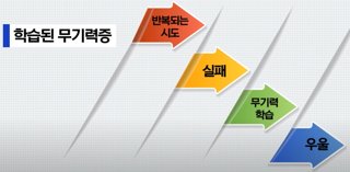 항우울제 효과를 확인하기 위한 실험 중 '로 솔트 강제 수영 실험'이라는 것이 있습니다. 물이 들어있는 수조에 생쥐 한 마리를 넣고 관찰을 합니다. 생쥐는 물에 빠지지 않기 위해 안간힘을 쓰며 헤엄을 치기 시작합니다. 수없이 시도해도 수조 밖으로 탈출할 가능성이 없다는 것을 알게 되자 더 이상 헤엄을 포기하게 됩니다. 무기력이 학습되어 더 이상 시도하지 않게 된 것이죠. 이것을 학습된 무기력이라고 합니다.
