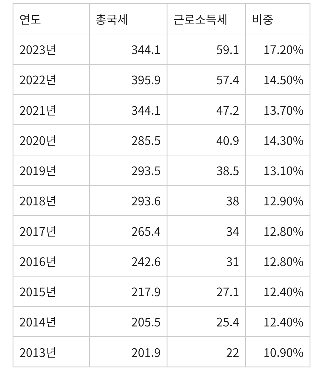 그 결과 총 국세(344조 1000억 원)에서 차지하는 근로소득세의 비중은 2022년 14.5%에서 지난해 17.2%로 높아졌다. 이는 2013년 이후 근 10년간 가장 높은 수치다.