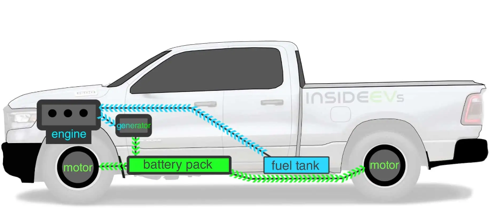 램차저 1500 모델은 전기배터리와 2개의 모터로 구동되는 새로운 방식의 하이브리드 픽업트럭입니다.
