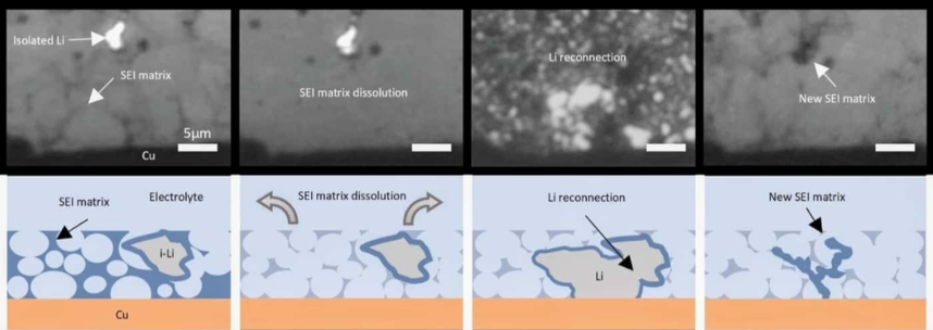 리튬 메탈이 분리되면 새로 형성된 SEI(이중 고체 전해질 계면) 매트릭스에 의해 포획되어 덴드라이트(수지상정)가 됩니다. 포획되면 더 이상 배터리 충전 사이클에 기여하지 않게 되는데 이 경우 수지상 리튬은 "죽은 것"으로 간주되어 셀의 충전 용량이 감소하여 배터리 성능이 저하됩니다. 배터리 열화는 일반적으로 비가역적, 다시 말해 한번 발생하면 되돌릴 수 없는 것으로 간주됩니다.