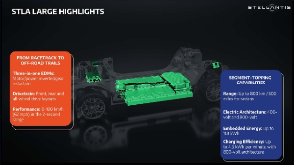 STLA Large 플랫폼은 단일 모터 및 듀얼 모터 버전이 제공되며, 전기 전면구동(FWD), 후면구동(RWD) 및 전륜구동(AWD) 설정을 포함한 다양한 파워트레인 유형을 처리할 것입니다. 이 플랫폼은 기본 버전에서 85 kWh 배터리 팩 및 고사양 모델에서 더 큰 118 kWh 팩을 지원할 것으로 예상되므로, 이 대형 플랫폼은 더 큰 배터리를 탑재할 것입니다. 그러나 이 플랫폼은 배터리 셀 캐미스트리 교환 가능성을 염두에 두고 설계되어 가까이는 LFP와 삼원계, 멀리는 전고체배터리를 품을 수도 있습니다.