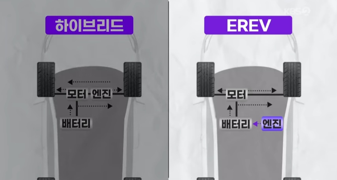 기존의 전기차가 배터리를 이용하여 모터로 구동하던 방식임에 반해, EREV는 배터리를 충전해 주는 내연기관을 탑재하여 거리를 연장한 차량입니다. 즉 기존의 EV가 충전속도나 주행거리면에서 내연기관차량 대비 부족함이 있었다면, EREV는 내연기관을 통해 이러한 단점을 보완한 방식입니다.