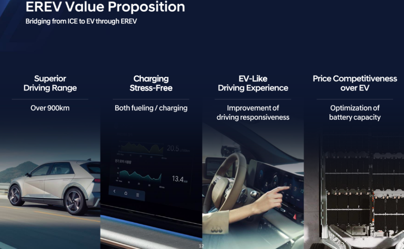 현대는 2026년 북미와 중국시장에 EREV를 탑재한 차량을 선보일 계획입니다. 기사에서 처럼 제네시스 모델이 유력해 보이지만 '아이오닉 9' 모델이 될 수도 있어 보입니다. 현대는 두 개의 모터를 적용하여 사륜구동을 가능하게 하는 독특한 파워트레인과 전력전자 시스템을 선보일 예정입니다. 연간 생산목표는 약 8만대 수준으로 예상되고 있습니다.