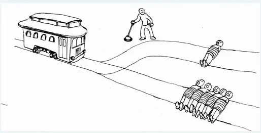 만일 불행하게도 부득이한 사고 상황에 따라 대로변의 많은 사람들과 차 안의 운전자 중 어느 한쪽을 살려야 한다고 가정해 봅시다. 차량의 핸들을 돌리지 않으면 운전자가 , 핸들을 돌리면 보행자들이 죽는 상황입니다.