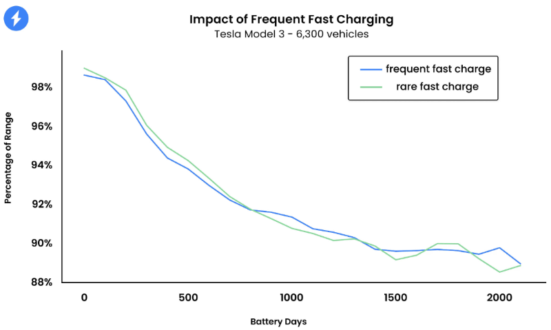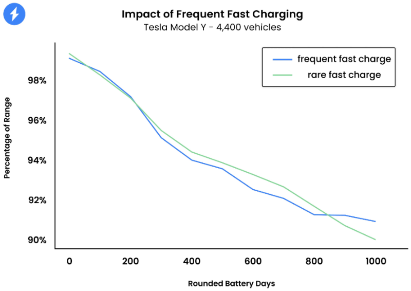 위 그래프에서 보다시피 고속충전 빈도가 높은 그룹과 낮은 그룹 간의 주행거리 성능저하 간의 연관성은 미미합니다. 다시 말해서 실제 충전소에서 사용하는 고속충전을 자주 이용하더라도 전기차의 수명저하에 크게 영향을 미치지 않는다는 의미입니다.