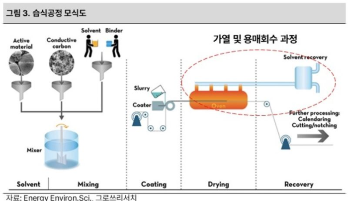 그동안 리튬이온배터리의 제조공정은 니켈, 코발트, 망간 등으로 이루어진 활물질과 도전재, 바인더 등을 용매에 섞어진 슬러리(Slurry) 형태로 금속 극판에 코팅한 후 건조로를 통해 건조하는 방식인 습식공정(Wet)을 사용해 왔습니다. 따라서 슬러리 제조를 위한 공정 및 건조를 위한 건조로와 설비가 필수적이었습니다.
