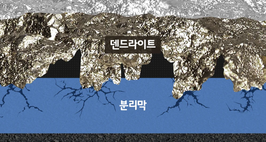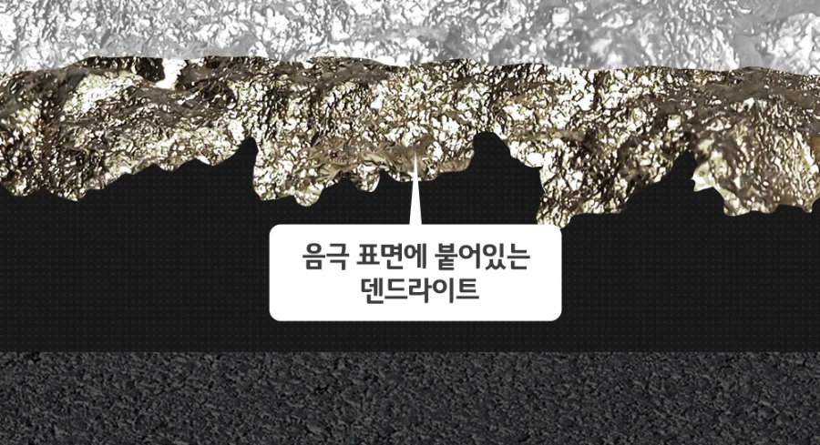 앞서 설명한 대로 배터리 화재 메커니즘 중에서 분리막의 외부 파손을 유발하는 원인 중 치명적인 것이 바로 덴드라이트(Dendrite)입니다. 일명 수지상정이라고도하는데 과충전 시 음극에서 일종의 나뭇가지가 자라듯이 덴드라이트가 자랄 수 있는데 침상형으로 생겨 성장에 따라 분리막을 뚫을 수 도 있습니다. 이렇게 되면 분리막의 역할을 제대로 할 수 없고, 양극과 음극의 접촉으로 인해 결국 화재로 이어질 수밖에 없습니다.