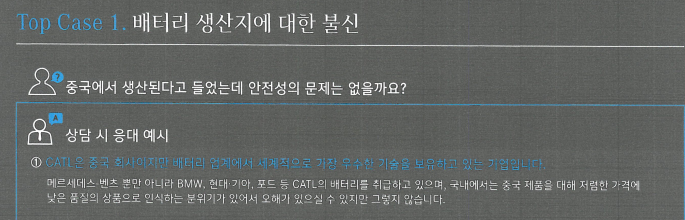 국내 소비자들이 중국 제품에 대한 불신이 있다는 것을 미리 알고 벤츠코리아에서는 영업담당자들에게 조직적으로 해당 배터리가 'CATL'이라고 소개하도록 지시했습니다. CATL은 글로벌 배터리시장 점유율이 35%가 넘는 현재 1위 배터리 회사인 반면에 '파라시스'는 Big5에도 들지 못하는 그런 회사입니다.