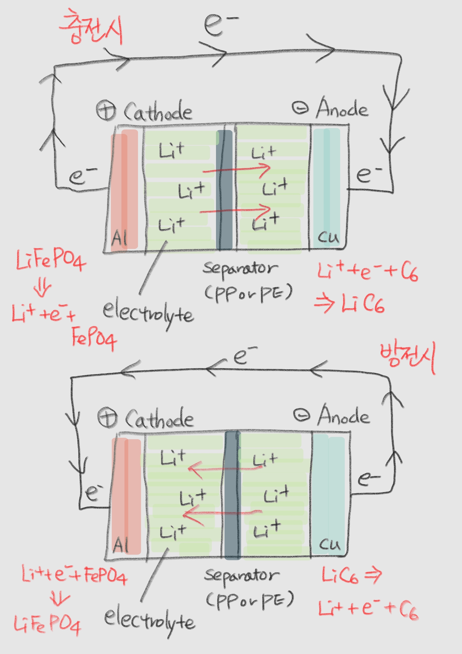 아래 도식은 리튬인산철(LiFePO4) 배터리를 기준으로 나타내었습니다.