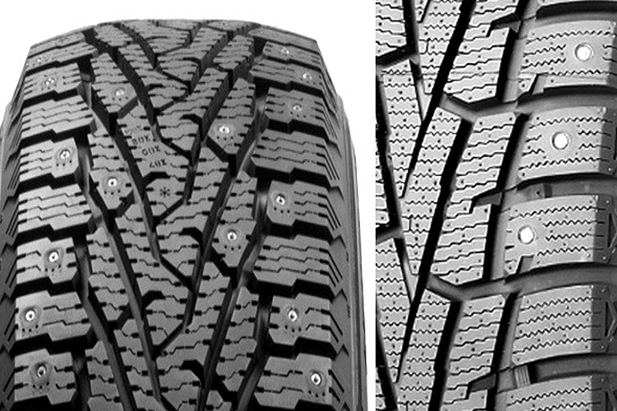 스터드 타이어는 트레드 표면에 박힌 금속 핀이 얼음을 파고들어 강력한 접지력을 발휘합니다.