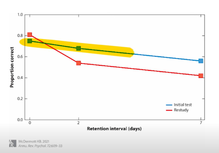 시험내용을 2회 반복한 실험군(A)과 1회 공부 후 떠올리기를 한 실험군(B)의 비교 데이터입니다. 테스트 후 5분 뒤 시험을 진행한 경우 반복한 실험군(A)의 성적이 높았지만, 2일 후 , 7일 후의 성적은 떠올리기를 한 실험군(B)이 더 높을 결과를 보였습니다.
