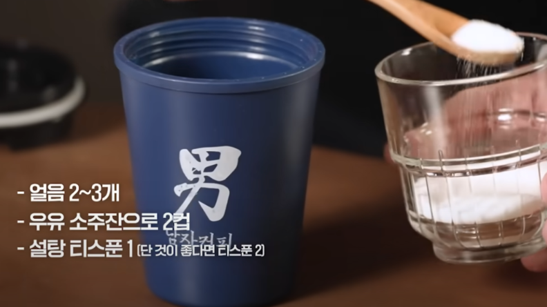 뚜껑이 있는 밀봉할 수 있는 텀블러를 하나 준비합니다. 그속에 얼글을 3~4개 채우고 우유와 설탕을 넣고 힘차게 흔들어 줍니다. 안에서 설탕이 갈리는 소리가 들리시죠? 이때 우유 속에 설탕이 모두 녹을 때까지 진행합니다.