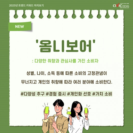 옴니보어는 하나의 틀에 얽매이지 않고, 다양한 분야에서 자신만의 취향을 탐구하는 사람들입니다. 예를 들어, 아침에는 클래식 음악을 들으며 커피를 마시고, 점심에는 최신 K-팝에 맞춰 춤을 추며, 저녁에는 친환경 패션 브랜드를 탐색하는 식이죠. 이들은 경계를 허물고, 패션, 음식, 문화, 기술 등 다양한 영역에서 새로운 경험을 즐깁니다.