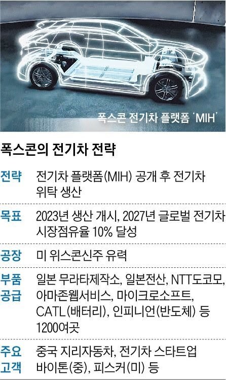 현대차그룹·폴크스바겐·GM 등 기존 자동차 기업들이 독자 플랫폼으로 전기차를 쏟아내고 있지만, 폭스콘은 플랫폼 개방을 통한 규모의 경제를 활용해 단기간에 선발 주자들을 따라잡겠다는 전략이라고 하네요.