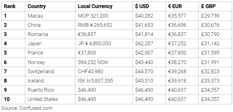 테슬라 모델 3를 가장 저렴하게 구입할 수 있는 나라는 중국 남부에 위치한 마카오입니다. 거대한 카지노로 유명한 마카오는 세계에서 가장 싼 가격으로 테슬라 모델 3를 구매할 수 있습니다. 마카오는 2위에 중국과 3위의 루마니아 보다 몇 100달러나 더 낮은 가격에 테슬라 모델 3을 구매할 수 있습니다.