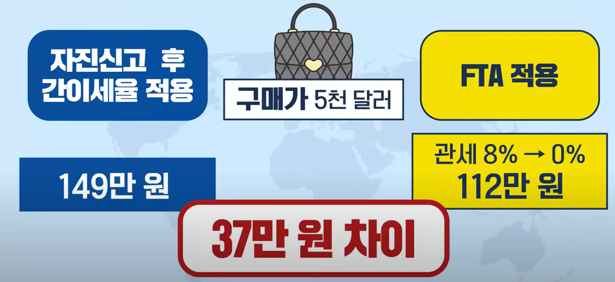 5000달러의 가방을 산 경우에는 면세한도 600달러를 제한 4400달러에 대해 자진신고 후 간이세율을 적용할 경우 149만 원의 세금을 지불해야 하지만 FTA를 적용할 경우 8% 관세를 면제받아 112만 원을 납부하면 되므로 37만 원을 절약할 수 있게 됩니다. 즉 구매물품의 가격이 크면 클수록 더 큰 혜택을 받을 수 있습니다.