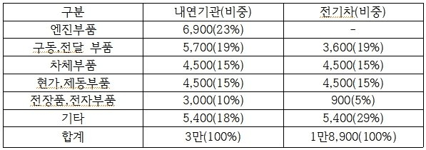 전기차에는 기존에 사용되던 엔진과 변속기 발전기 그리고 연료 관련 탱크와 필터, 펌프 등 많은 부품이 없습니다. 또한 엔진과 관련된 냉각장치도 사라지게 됩니다. 이처럼 전기차 전환 시 사라지는 부품으로 인해 관련 업체수는 약 9.7%가 감소하게 되며, 제조업 종사자 수도 약 9% 감소할 전망입니다.